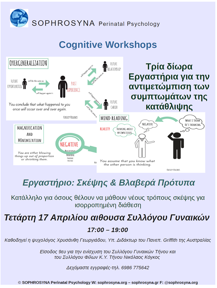 Μία σειρά από τρία εργαστήρια που στοχεύουν στην αντιμετώπιση των συμπτωμάτων της κατάθλιψης με τις τεχνικές της Γνωσιακής-Συμπεριφορικής Θεραπείας διοργανώνει η SOPHROSYNA. Το πρώτο εργαστήριο ξεκινάει Τετάρτη 17 Απριλίου στην αίθουσα του Συλλόγου Γυναικών Τήνου. 17:00-19:00.