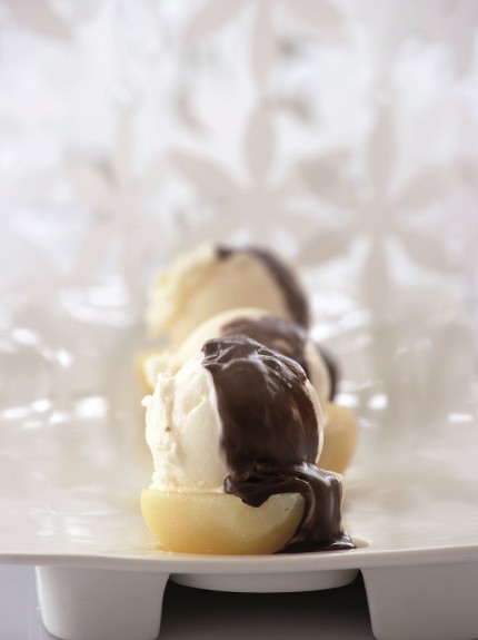 Για να σερβίρετε: Κόβετε το κάθε αχλάδι στη μέση και τοποθετείτε τα δύο μισά του σε ένα πιάτο μαζί με λίγο από το σιρόπι τους. Προσθέτετε από μια μπάλα παγωτού βανίλια. Περιχύνετε τα αχλάδια και το παγωτό με ζεστή σάλτσα σοκολάτας και σερβίρετε αμέσως.