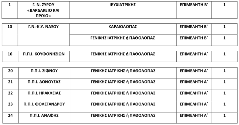Την προκήρυξη για την πλήρωση των παρακάτω επί θητεία θέσεων ειδικευμένων ιατρών του κλάδου Ε.Σ.Υ. των Νοσοκομείων και των Μονάδων Πρωτοβάθμιας Φροντίδας Υγείας αποφάσισε το αρμόδιο υπουργείο. Στις Κυκλάδες προβλέπονται 9 θέσεις.