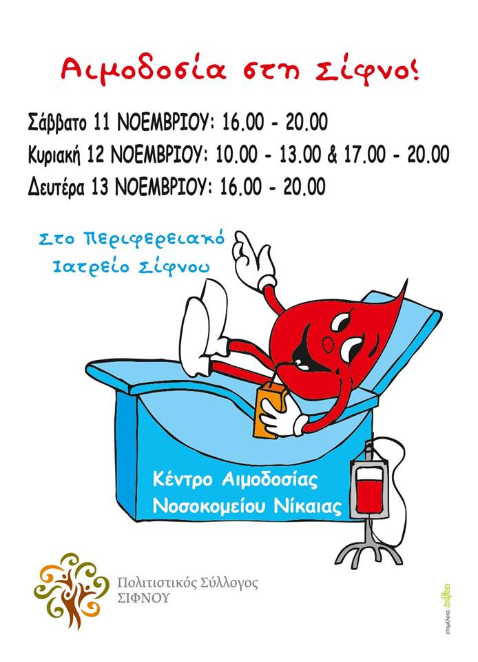 Ο ΠΟΛΙΤΙΣΤΙΚΟΣ ΣΥΛΛΟΓΟΣ ΣΙΦΝΟΥ & το ΚΕΝΤΡΟ ΑΙΜΟΔΟΣΙΑΣ του ΝΟΣΟΚΟΜΕΙΟΥ ΝΙΚΑΙΑΣ, σε συνεργασία με το ΠΕΡΙΦΕΡΕΙΑΚΟ ΙΑΤΡΕΙΟ ΣΙΦΝΟΥ, σας προσκαλούν να δώσετε το «παρών» και σε αυτή την αιμοδοσία, αιμοδοτώντας στο φιλόξενο χώρο του Ιατρείου μας σύμφωνα με το παρακάτω πρόγραμμα: