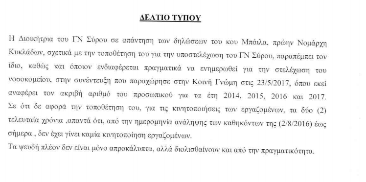 Aigaio365 > ΚΥΚΛΑΔΕΣ > ΣΥΡΟΣ > ΓΝ Σύρου: Απροκάλυπτα τα ψεύδη του κ. Μπάιλα
