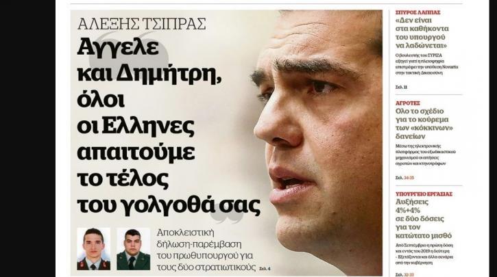 «Άγγελε και Δημήτρη όλοι οι Έλληνες απαιτούμε το τέλος του Γολγοθά σας» αναφέρει σε μήνυμά του και σε προσωπικό τόνο ο πρωθυπουργός Αλεξης Τσίπρας, με δήλωσή του στην εφημερίδα Documento, απευθυνόμενος στους δυο Έλληνες στρατιωτικούς -τον Άγγελο Μητρετώδη και τον Δημήτρη Κούκλατζη που κρατούνται στις φυλακές της Αδριανούπολης από την 1η Μαρτίου, όταν και συνελήφθησαν στις Καστανιές Έβρου.