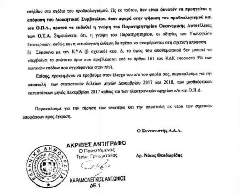 «Σύμφωνα με το αρθ. 77 του ν. 4172/2013 το σχέδιο του προϋπολογισμού υποβάλλεται από την οικονομική επιτροπή στο δημοτικό συμβούλιο προς συζήτηση και ψήφιση και υποχρεωτικά συνοδεύεται από τη γνώμη του Παρατηρητηρίου, τις οδηγίες του Υπουργείου Εσωτερικών, καθώς και από αιτιολογική έκθεση [….] Ως εκ τούτου δεν είναι δυνατόν να προηγείται η απόφαση του ΔΣ, όσον αφορά τη ψήφιση του προϋπολογισμού προτού εκδοθεί η γνώμη του Παρατηρητηρίου Οικονομικής Αυτοτέλειας των ΟΤΑ.»