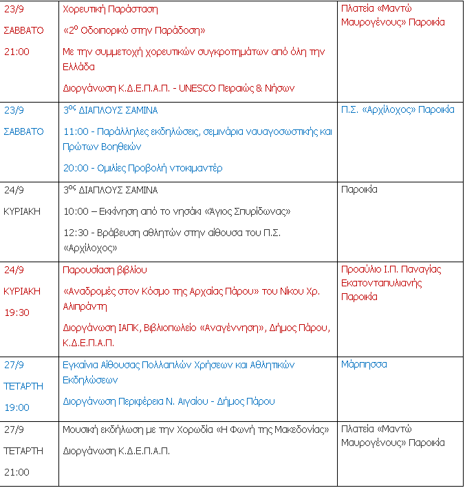 Η Κοινωφελής Δημοτική Επιχείρηση Πολιτιστικής Ανάπτυξης Πάρου (Κ.Δ.Ε.Π.Α.Π.) δημοσιοποίησε το πρόγραμμα εκδηλώσεων που θα γίνουν στην Πάρο από το Σάββατο 23 Σεπτεμβρίου έως και την Τετάρτη 27 Σεπτεμβρίου 2017.