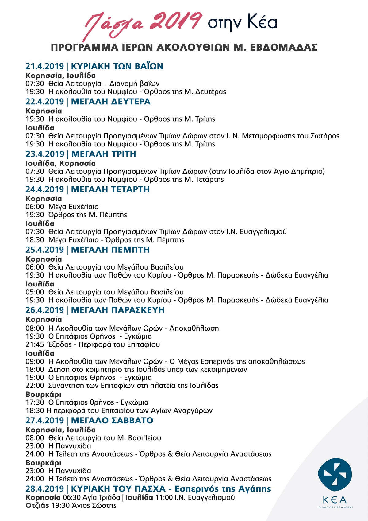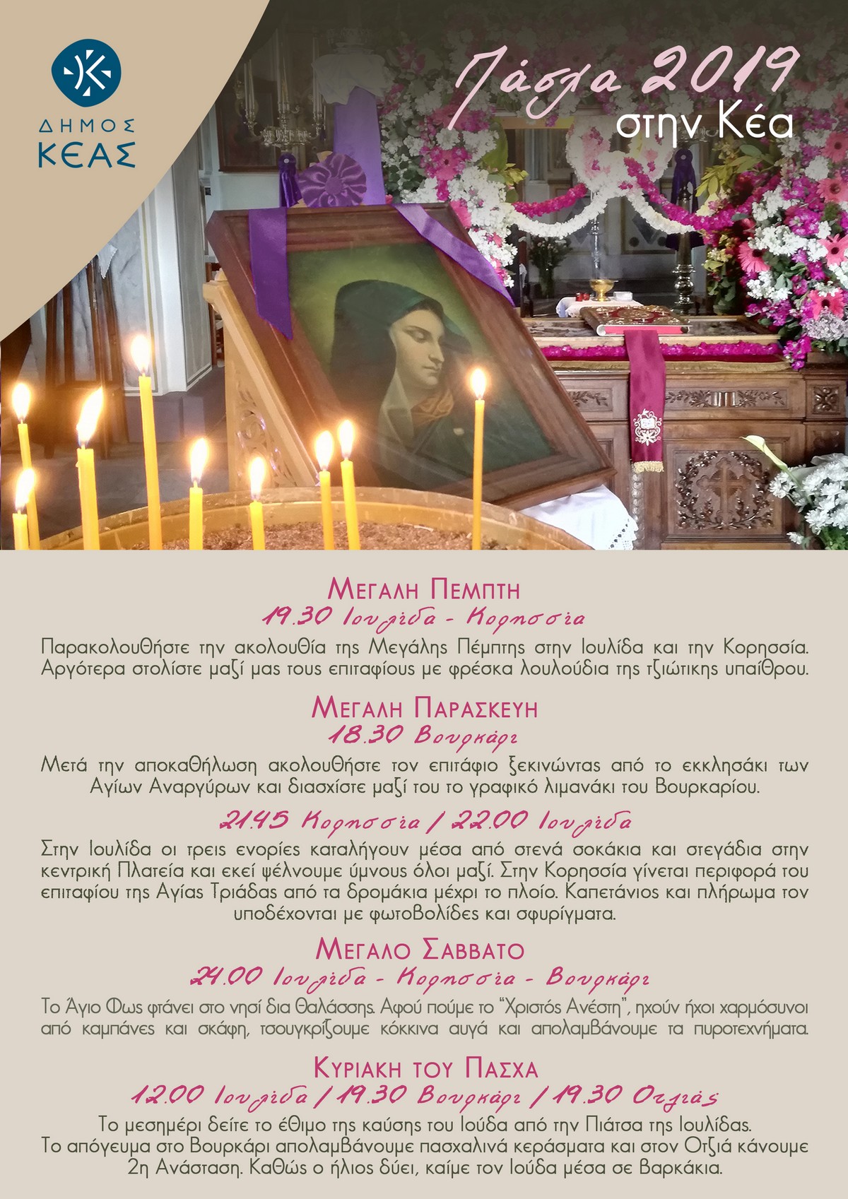 Η τζιώτικη φιλοξενία, τα έθιμα, η ευλαβική ατμόσφαιρα, τα κατάλευκα κυκλαδίτικα σοκάκια, οι παραδοσιακές γεύσεις και τα αρώματα, η θαλασσινή αύρα κάνουν κάθε χρόνο το Πάσχα στην Κέα μία εμπειρία αξεπέραστη. Σας περιμένουμε να τη ζήσουμε μαζί!