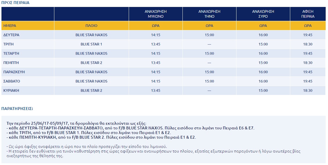Όπως έπραξε πέρυσι έτσι και φέτος η Blue Star Ferries πραγματοποιεί δρομολόγια -κατά τους καλοκαιρινούς μήνες- από Πειραιά για Σύρο-Τήνο-Μύκονο.