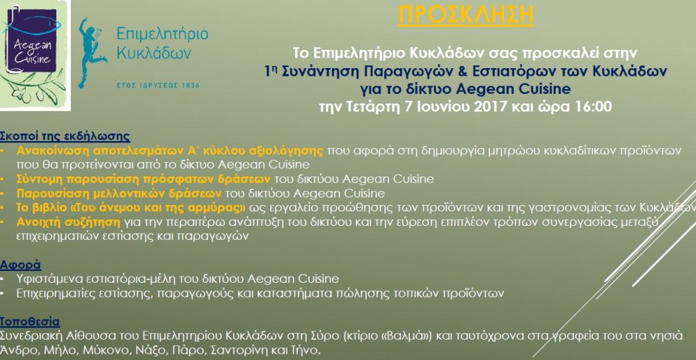 Με την παρούσα έχω τη χαρά να σας προσκαλέσω, εκ μέρους του Διοικητικού Συμβουλίου του Επιμελητηρίου Κυκλάδων, στην 1η Συνάντηση Παραγωγών & Εστιατόρων των Κυκλάδων που θα πραγματοποιηθεί την Τετάρτη 7 Ιουνίου 2017 και ώρα 16:00 με αφορμή την ανακοίνωση των αποτελεσμάτων του Α’ κύκλου αξιολόγησης που αφορά στη δημιουργία μητρώου προϊόντων τα οποία παράγονται στις Κυκλάδες και θα προτείνονται από το δίκτυο Aegean Cuisine.
