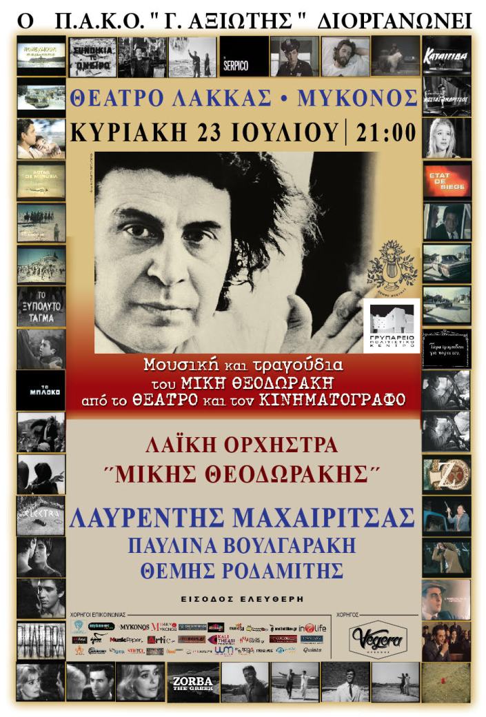 Στο θεατράκι της Λάκκας την Κυριακή 23 Ιουλίου 2017, στις 21:00 θα πραγματοποιηθεί αφιέρωμα στον Μίκη Θεοδωράκη με τη συμμετοχή των Λαυρέντη Μαχαιρίτσα, Παυλίνας Βουλγαράκη, Θέμη Ροδαμίτη και της Λαϊκής ορχήστρας Μίκη Θεοδωράκη!