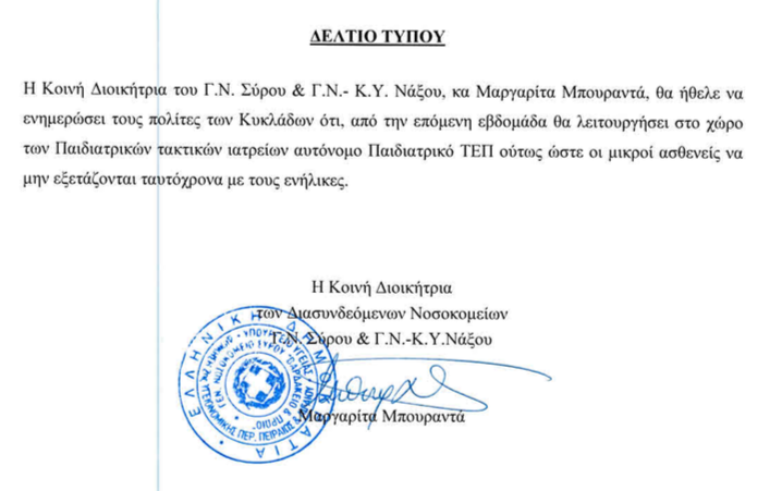 Δύο Δελτία Τύπου, τα οποία αφορούν την έναρξη λειτουργίας Αυτόνομου Παιδιατρικού Τμήματος Επειγόντων Περιστατικών και την πρόσληψη νέου ΩΡΛ εξέδωσε το Νοσοκομείο Σύρου.