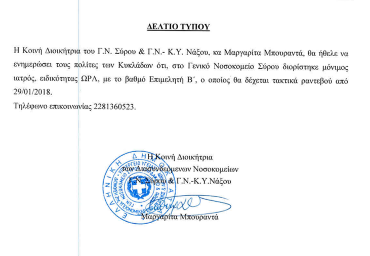 Aigaio365 > ΚΥΚΛΑΔΕΣ > ΣΥΡΟΣ > Αυτόνομο Παιδιατρικό ΤΕΠ και νέος Ωτορινολαρυγγολόγος στο Νοσοκομείο Σύρου