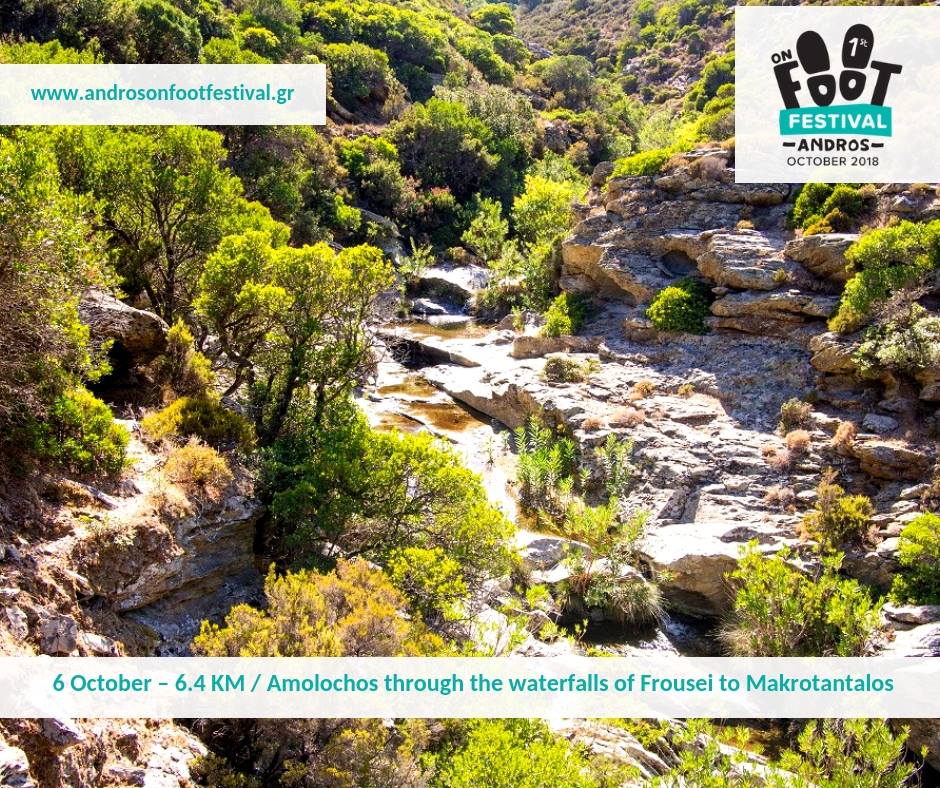 Το 1ο Φεστιβάλ Πεζοπορίας αποτελεί μια γιορτή «εξερεύνησης με τα πόδια», στη μοναδική φύση της Άνδρου. Πρόκειται για 23 ημέρες πεζοπορίας στα υπέροχα φυσικά τοπία, στα γραφικά χωριά της Άνδρου και σε σημαντικά μνημεία. Περιλαμβάνει πανηγύρια, μουσική, παιχνίδια, πολιτιστικές δράσεις, γνωριμία με τα τοπικά ήθη και έθιμα και τις τοπικές γεύσεις, σε συνεργασία με τους πολιτιστικούς συλλόγους κάθε περιοχής.