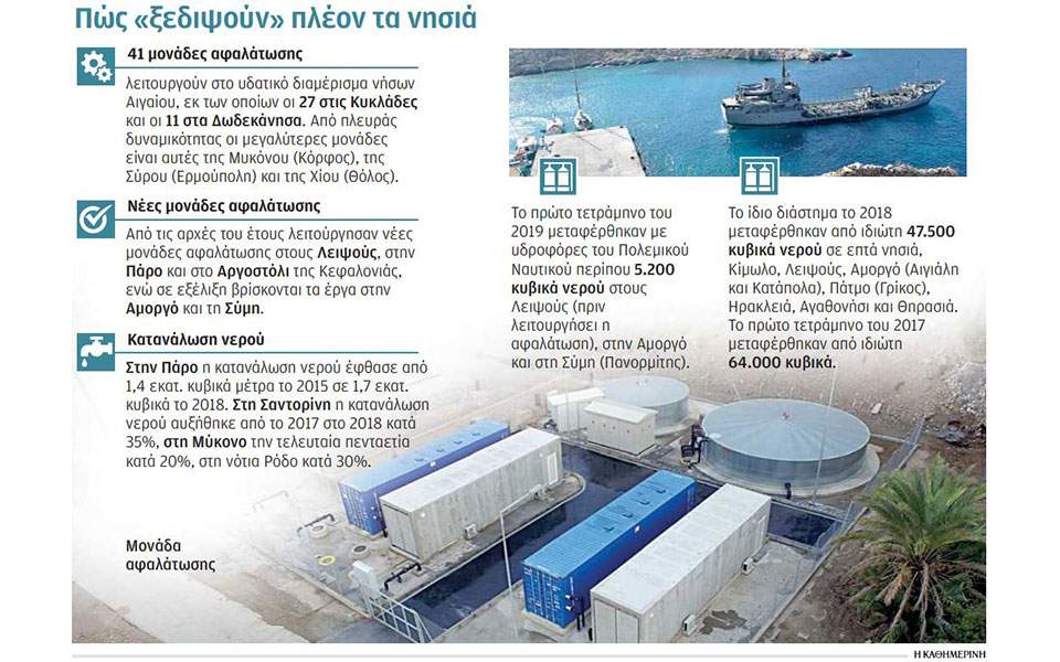 Σύμφωνα με το σχέδιο διαχείρισης του Υδατικού Διαμερίσματος Νήσων Αιγαίου, το 2017 λειτουργούσαν 41 μονάδες αφαλάτωσης, εκ των οποίων οι 27 στις Κυκλάδες και οι 11 στα Δωδεκάνησα. Από πλευράς δυναμικότητας οι μεγαλύτερες μονάδες είναι αυτές της Μυκόνου (Κόρφος), της Σύρου (Ερμούπολη) και της Χίου (Θόλος). Η λειτουργία της αφαλάτωσης λύνει το πρόβλημα ποιότητας και επάρκειας νερού, ενώ η ανάθεση της λειτουργίας σε ιδιώτη (ένα μοντέλο που ξεκίνησε στη Μήλο και τα τελευταία χρόνια κερδίζει έδαφος) είναι ένας τρόπος να διασφαλίζεται η άρτια λειτουργία της. Ομως, υπάρχουν δύο βασικά προβλήματα: το κράτος (το υπουργείο Εσωτερικών ή η Γενική Γραμματεία Αιγαίου) επιδοτούν με διαφορετικά ποσά και «θολά» κριτήρια τις αφαλατώσεις. Και οι περισσότεροι από τους δήμους που τις λειτουργούν εξακολουθούν να χρεώνουν πολύ φθηνά το νερό, παρά το υψηλό κόστος λειτουργίας τους.