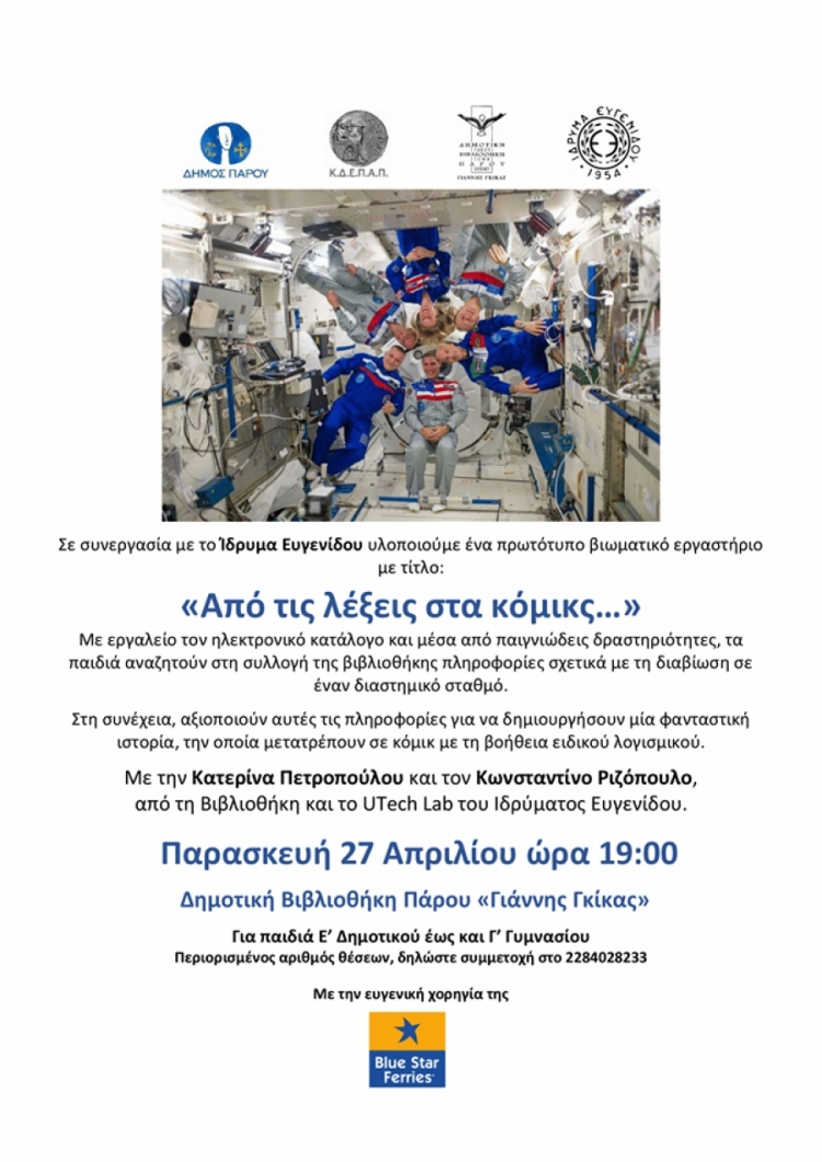 Η Δημοτική Βιβλιοθήκη Πάρου sε συνεργασία με το Ίδρυμα Ευγενίδου υλοποιούn ένα πρωτότυπο βιωματικό εργαστήριo με τίτλο: «Από τις λέξεις στα κόμικς…», την Παρασκευή 11 Μαΐου στις 19:00 στη Δημοτική Βιβλιοθήκη.