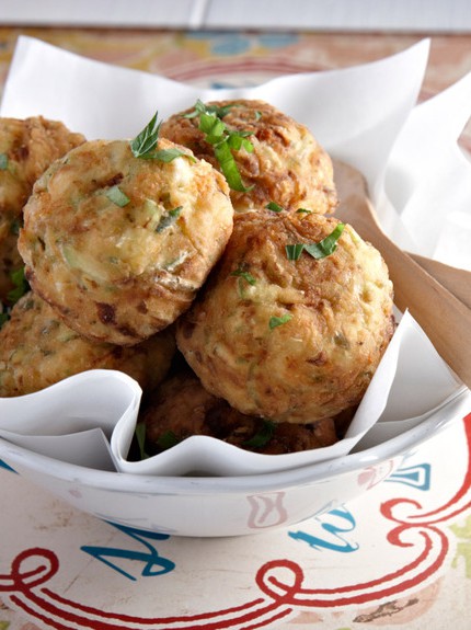 Πλάθετε κεφτέδες στο μέγεθος μικρού καρυδιού, τους πατικώνετε λίγο, τους αλευρώνετε και τους τινάζετε να φύγει το περιττό αλεύρι.
