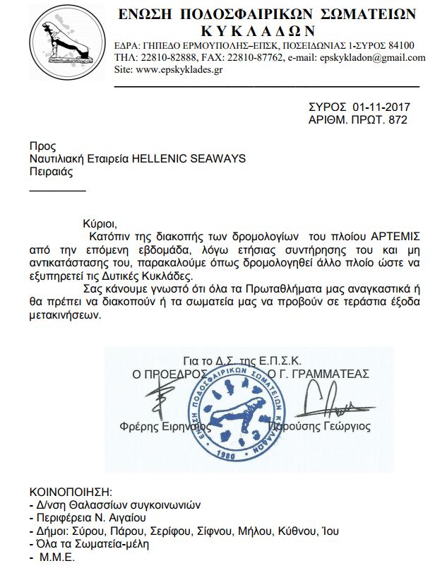 Η ΕΠΣ Κυκλάδων με έγγραφο της, το οποίο δημοσιοποίησε, ενημέρωσε την ναυτιλιακή εταιρία «HELLENIC SEAWAYS» για τον κίνδυνο της διακοπής των πρωταθλημάτων, ζητώντας την δρομολόγηση πλοίου αντικατάστασης.
