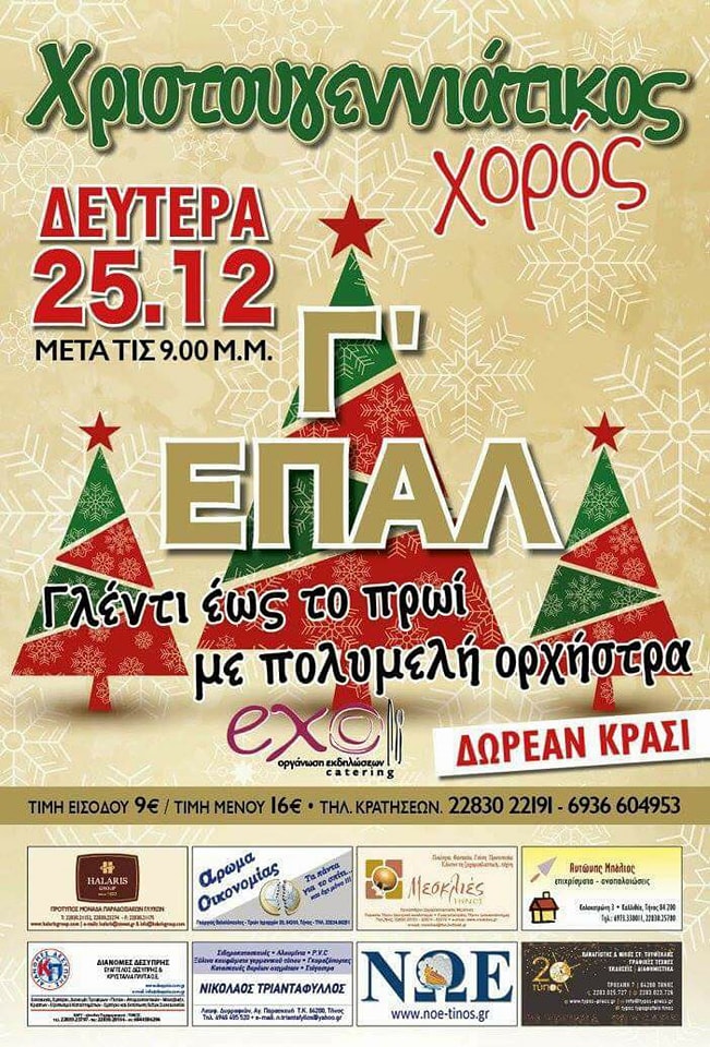 Οι μαθητές της Γ’ τάξης του ΕΠΑΛ Τήνου σας περιμένουμε στο χορό που διοργανώνουμε στο exo για να περάσουμε παρέα την γιορτή των Χριστουγέννων με άφθονο κρασί κι πολλά δώρα.