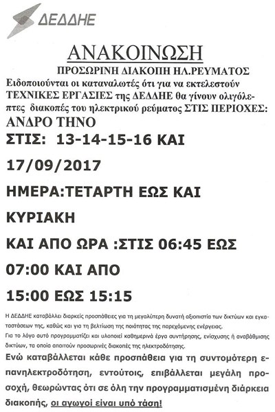 Από 13 έως και 17 Σεπτεμβρίου 2017, στις 06:45 – 07:00 και από 15:00 -15:15, θα γίνουν διακοπές στην ηλεκτροδότηση στα νησιά Άνδρου και Τήνου, προκειμένου να εκτελεσθούν τεχνικές εργασίες της ΔΕΔΔΗΕ.