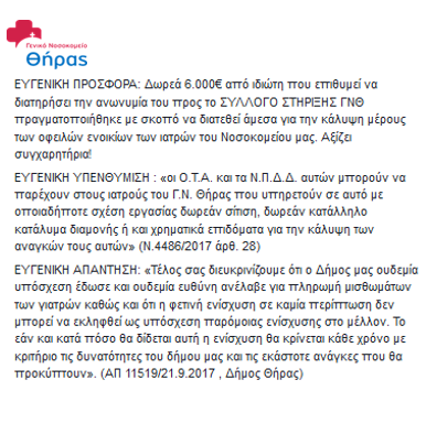 Δωρεά 6000 ευρώ στο Νοσοκομείο Σαντορίνης για να καλυφθούν οφειλές ενοικίων των γιατρών