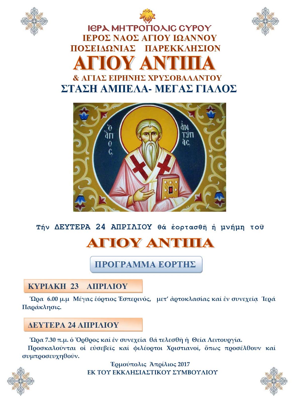 Γνωστοποιούμε τους ευσεβείς Χριστιανούς ότι ο εορτασμός του Αγίου Αντίπα θα πραγματοποιηθεί στο ομώνυμο Ιερό Παρεκκλήσιο που βρίσκεται στην περιοχή ‘’Στάση Αμπέλα’’ στο Μέγα Γιαλό, κατά το ακόλουθο πρόγραμμα: