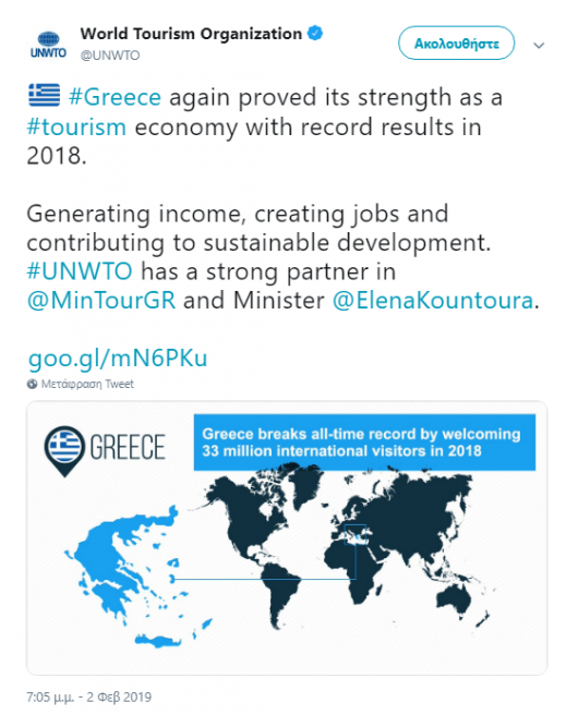 Την υπουργό Τουρισμού, Έλενα Κουντουρά, συνεχάρη σε ανακοίνωσή του μέσω twitter ο Παγκόσμιος Οργανισμός Τουρισμού των Ηνωμένων Εθνών (ΠΟΤ) επειδή για άλλη μία χρονιά πέτυχε επίδοση ρεκόρ στον ελληνικό τουρισμό το 2018.