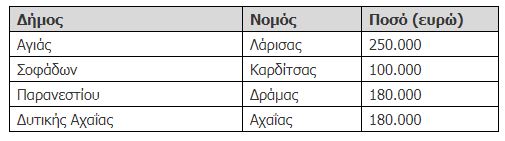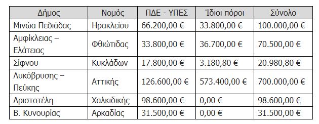 Οι δικαιούχοι δήμοι για τη χρηματοδότηση των ως άνω πράξεων, θα απορροφήσουν πρώτα τους πόρους του Υπουργείου Εσωτερικών. Στη συνέχεια θα χρησιμοποιηθούν οι ίδιοι πόροι των δήμων.