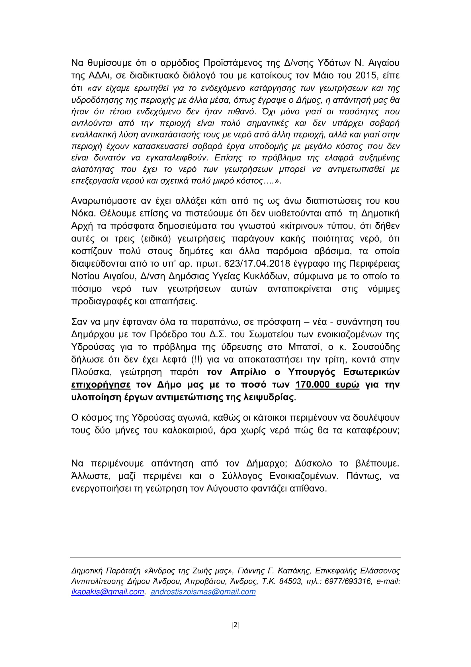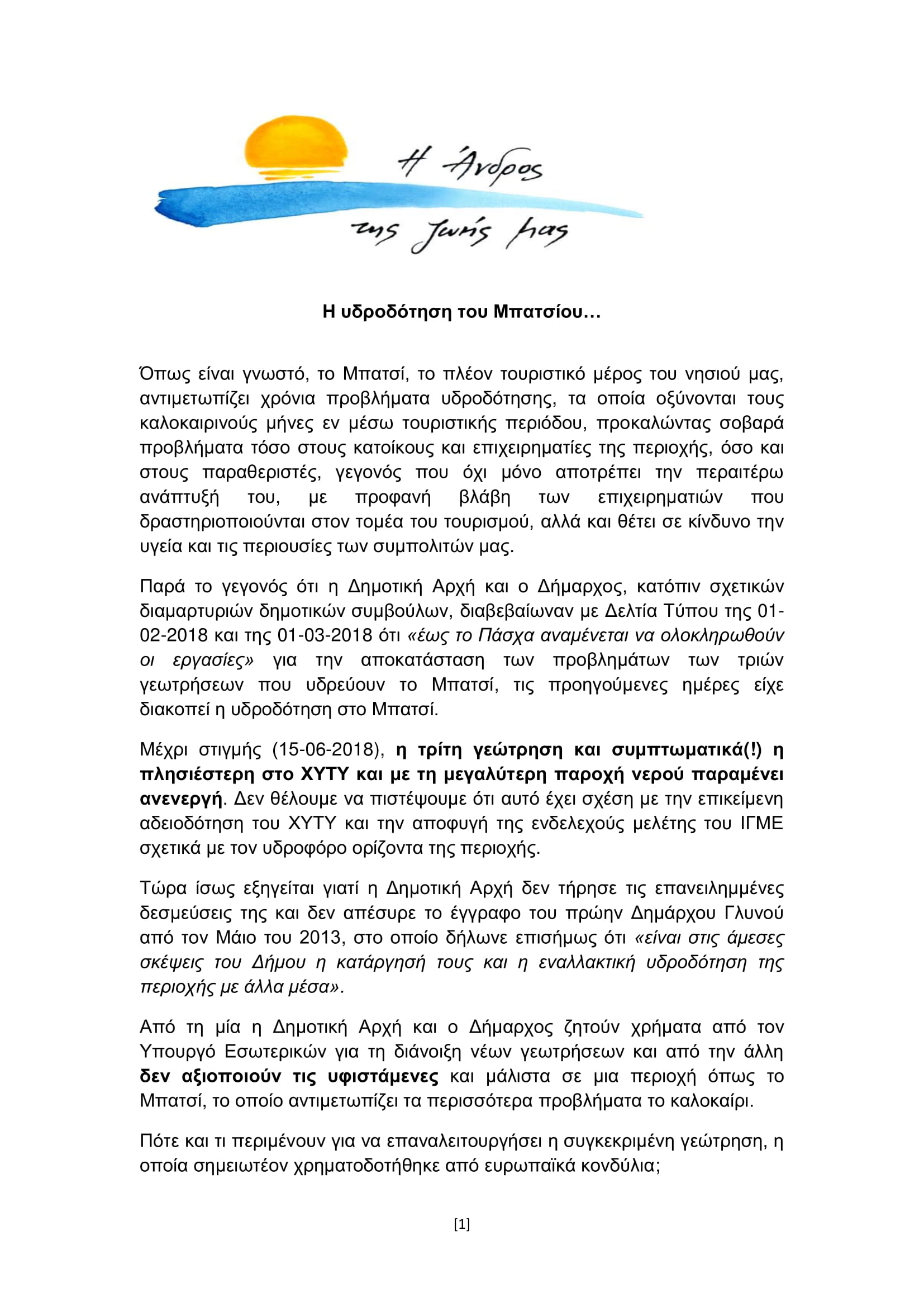 «Από τη μία η Δημοτική Αρχή και ο δήμαρχος ζητούν χρήματα από το Υπ. Εσωτερικών για τη διάνοιξη νέων γεωτρήσεων και από την άλλη δεν αξιοποιούν τις υφιστάμενες και μάλιστα σε μια περιοχή όπως το Μπατσί, τo οποίo αντιμετωπίζει τα περισσότερα προβλήματα το καλοκαίρι», επισημαίνει σε ανακοίνωσή της η δημοτική παράταξη «Άνδρος της Ζωής μας», με αφορμή το θέμα της υδροδότησης του Μπατσίου.