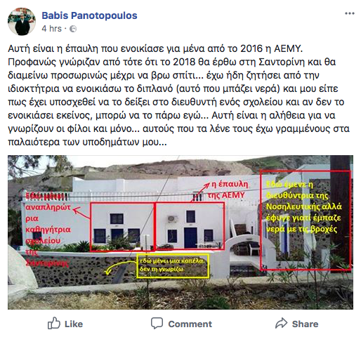 Ο διοικητής του Νοσοκομείου της Σαντορίνης απάντησε μέσω Facebook στη σημερινή ανακοίνωση της ΠΟΕΔΗΝ, η οποία υποστήριζε πως ο ίδιος μένει σε …βίλα στο νησί, την οποία πληρώνει ο ελληνικός λαός.