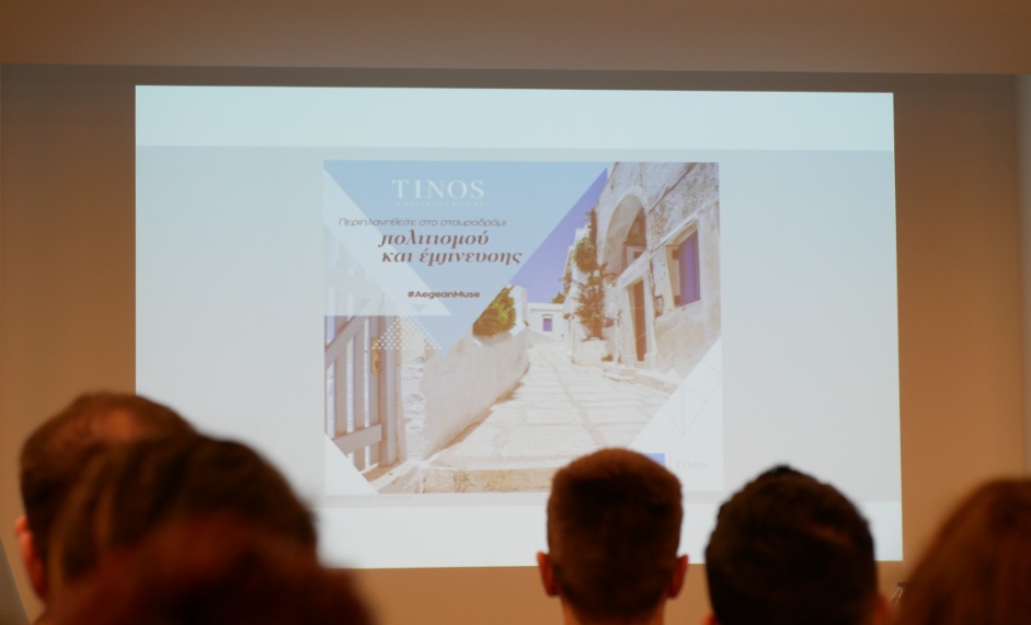 Η κυρία Δεληγιάννη προσκάλεσε τους φοιτητές να επισκεφθούν το νησί για να ζήσουν αυθεντικές εμπειρίες που θα μείνουν χαραγμένες στη μνήμη τους. Η παρουσίαση της κυρίας Τζάννου περιελάμβανε το δημιουργικό σκεπτικό της καμπάνιας «Τήνος. Η Μούσα του Αιγαίου» και την εφαρμογή της μέσω της παραγωγής ποιοτικού και σύγχρονου περιεχομένου. Το ενδιαφέρον των φοιτητών τράβηξαν τα θεματικά video που έχουν δημιουργηθεί για να υποστηρίξουν όλο το επικοινωνιακό πλάνο ενεργειών και αποτελούν χρήσιμο εργαλείο προβολής.