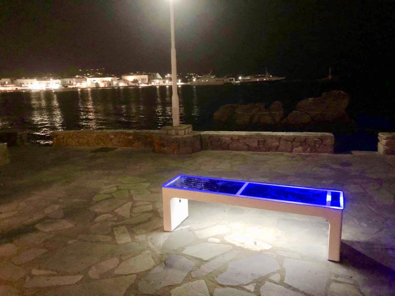 Η Δημοτική Αρχή Μυκόνου, σε συνεργασία με το Δημοτικό Λιμενικό Ταμείο, προμηθεύτηκε και τοποθέτησε έξυπνα «ηλιακά παγκάκια» που μετατρέπουν την ηλιακή ενέργεια σε ηλεκτρική, ενώ παράλληλα διαθέτουν δύο θύρες USB, όπου καθένας μπορεί να φορτίσει οποιαδήποτε ηλεκτρική συσκευή και μία θύρα επαγωγικής φόρτισης όπου μπορεί να γίνει η φόρτιση χωρίς καλώδιο, εφόσον τα κινητά διαθέτουν τεχνολογία ανέπαφης φόρτισης!