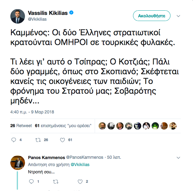 Μία επικριτική ανάρτηση για τον Πάνο Καμμένο, με αφορμή δηλώσεις του για τους δύο Έλληνες στρατιωτικούς, έκανε στο twitter ο τομεάρχης άμυνας της ΝΔ Β. Κικίλιας.