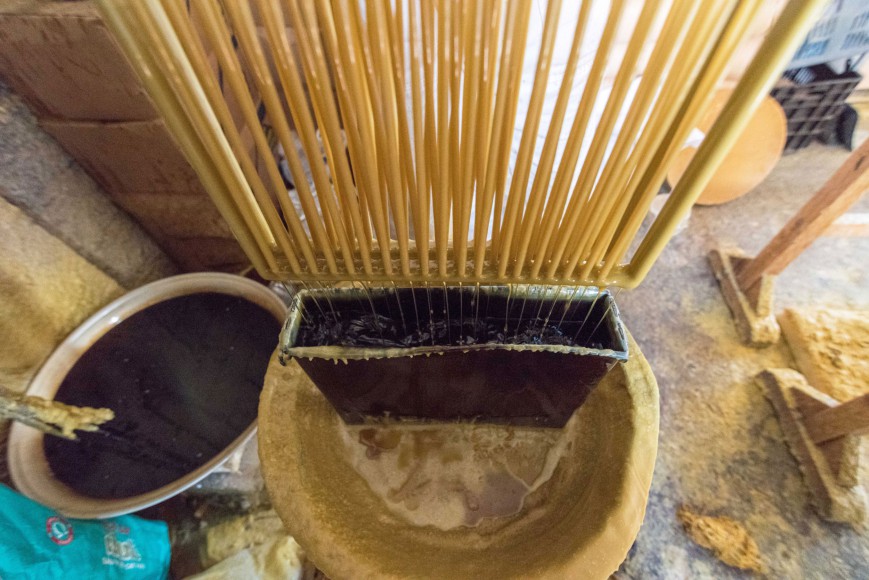 Αδειάζει το λιωμένο κερί σε ένα μακρύ δοχείο.
