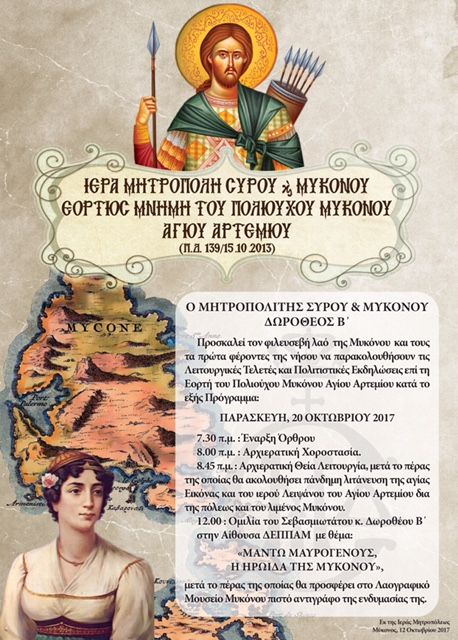 Ο Μητροπολίτης Σύρου – Μυκόνου, Δωρόθεος Β’ προσκαλεί όσους επιθυμούν να παρευρεθούν στις Λειτουργικές Τελετές και στις Πολιτιστικές Εκδηλώσεις για τον πολιούχο Μυκόνου, Αγίου Αρτεμίου, οι οποίες θα πραγματοποιηθούν στις 20 Οκτωβρίου.