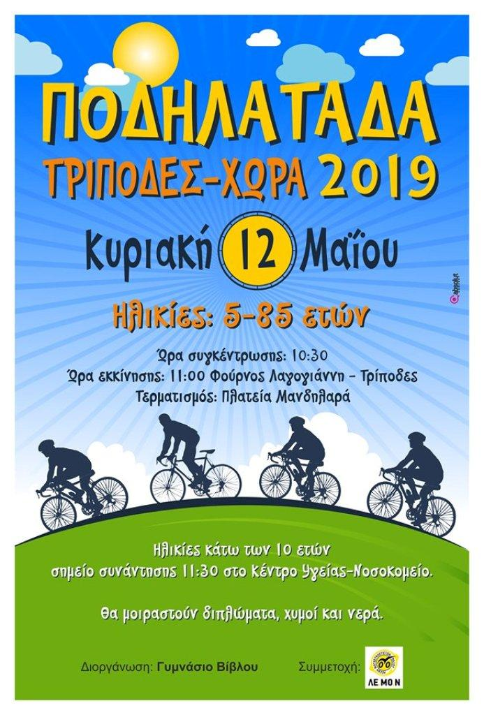 Το σχολείο μας, Γυμνάσιο Βίβλου Νάξου, στο πλαίσιο του εκπαιδευτικού προγράμματος της κυκλοφοριακής αγωγής που υλοποιεί το τρέχον σχολικό έτος με μαθητές/ μαθήτριες της Α΄ Γυμνασίου, θα πραγματοποιήσει στις 12-05-2019, ημέρα Κυριακή, ποδηλατάδα (όχι ποδηλατοδρομία!) από τη Βίβλο προς τη Χώρα της Νάξου.
