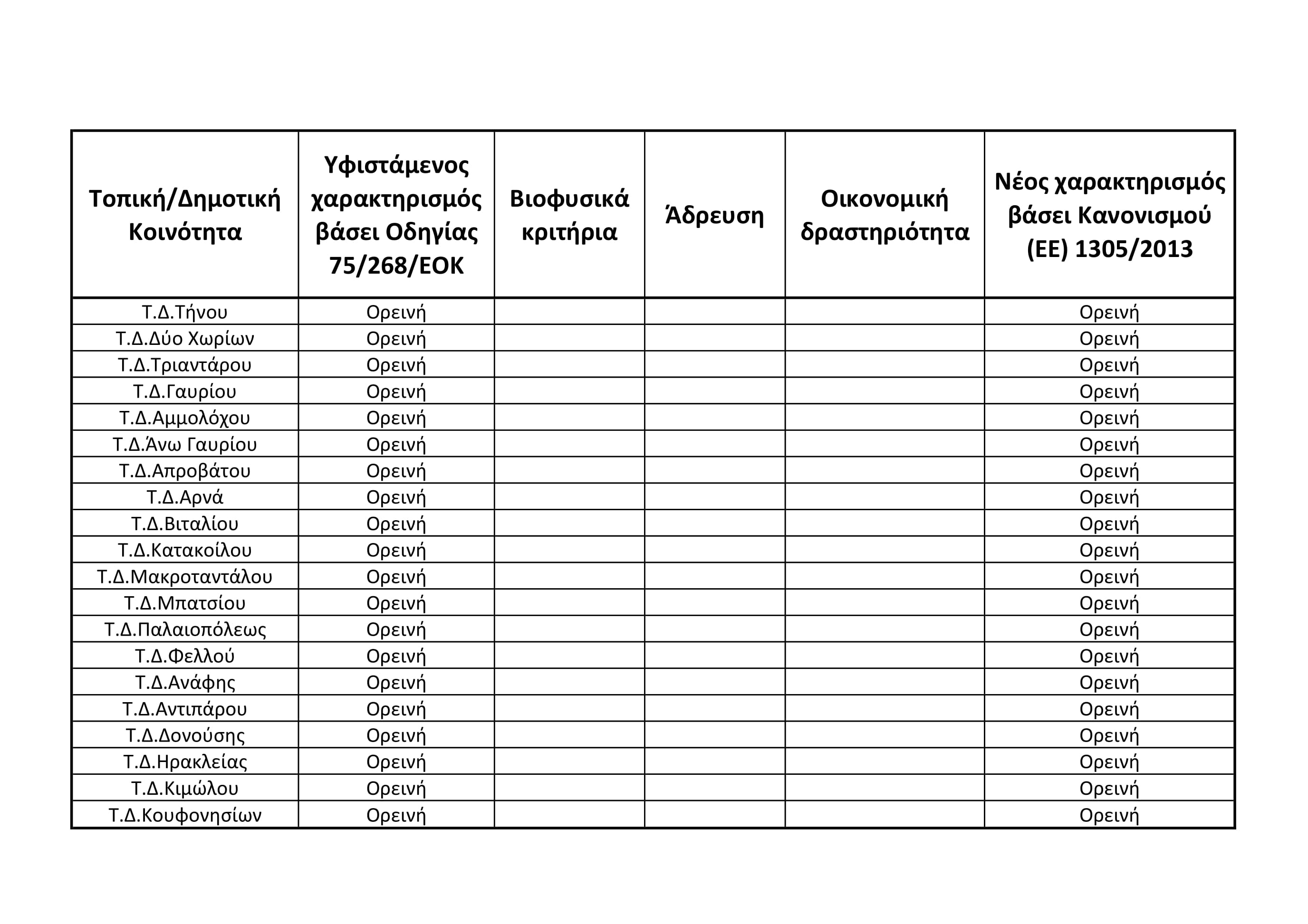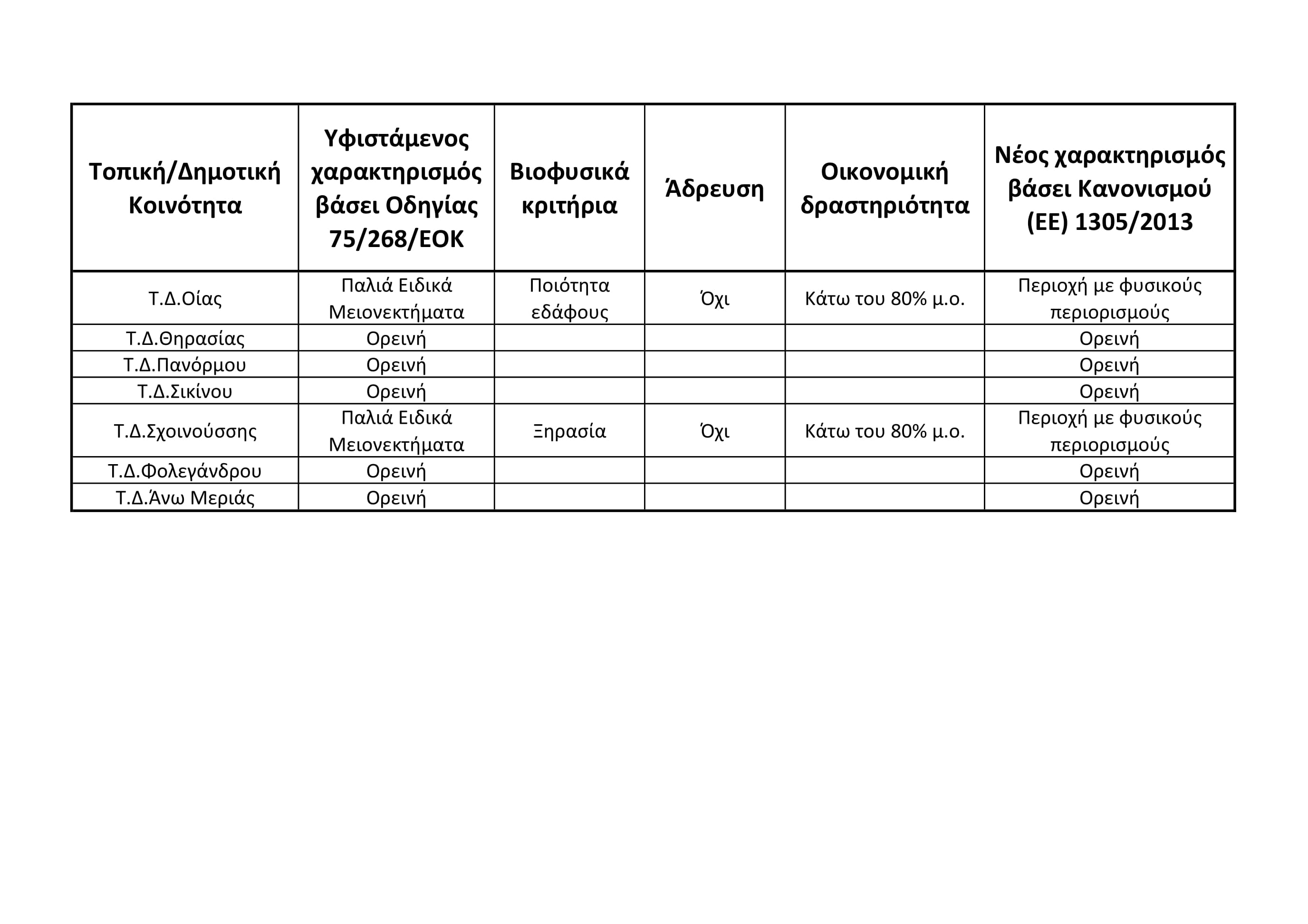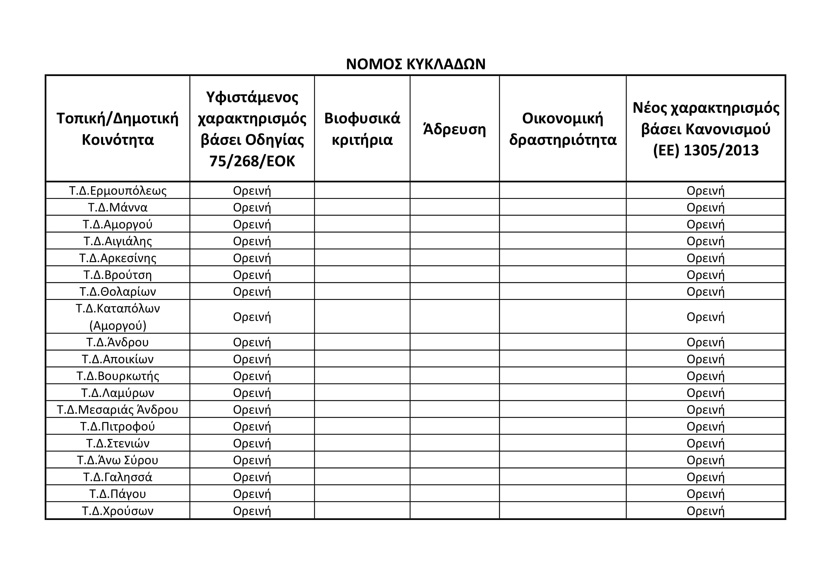 Σύμφωνα με τον επισυναπτόμενο πίνακα της νέας χάραξης των μειονεκτικών περιοχών στο Νομό Κυκλάδων, όλες οι περιοχές που χαρακτηρίστηκαν μειονεκτικές παραμένουν ως έχουν και καμία δεν βγαίνει εκτός αυτών.