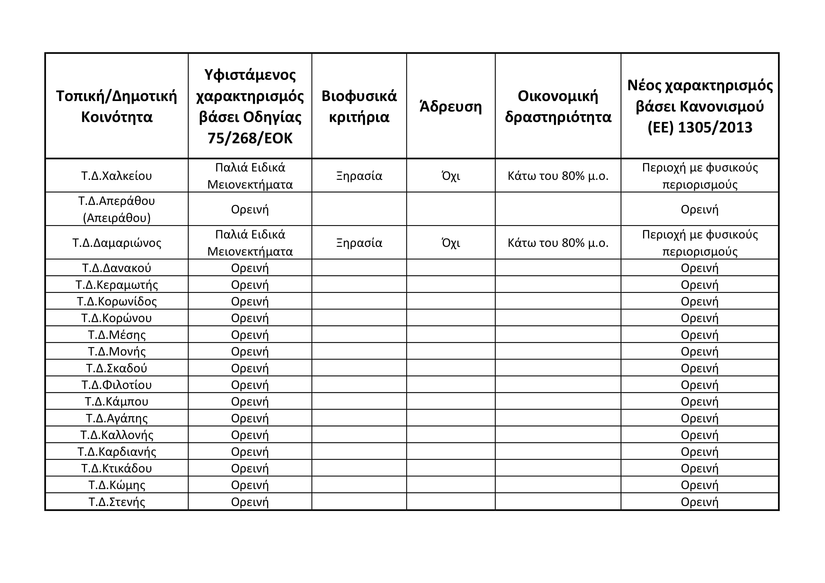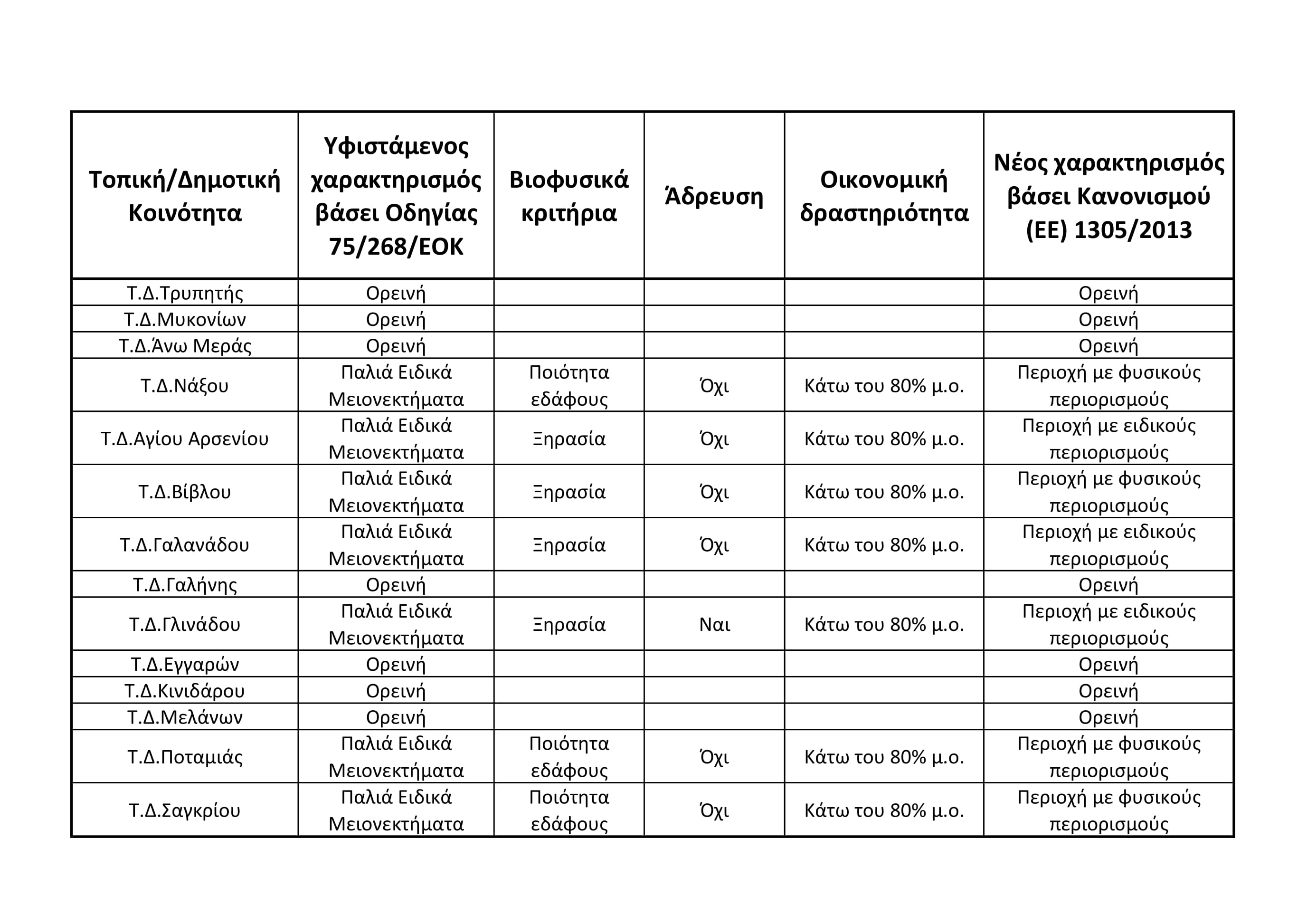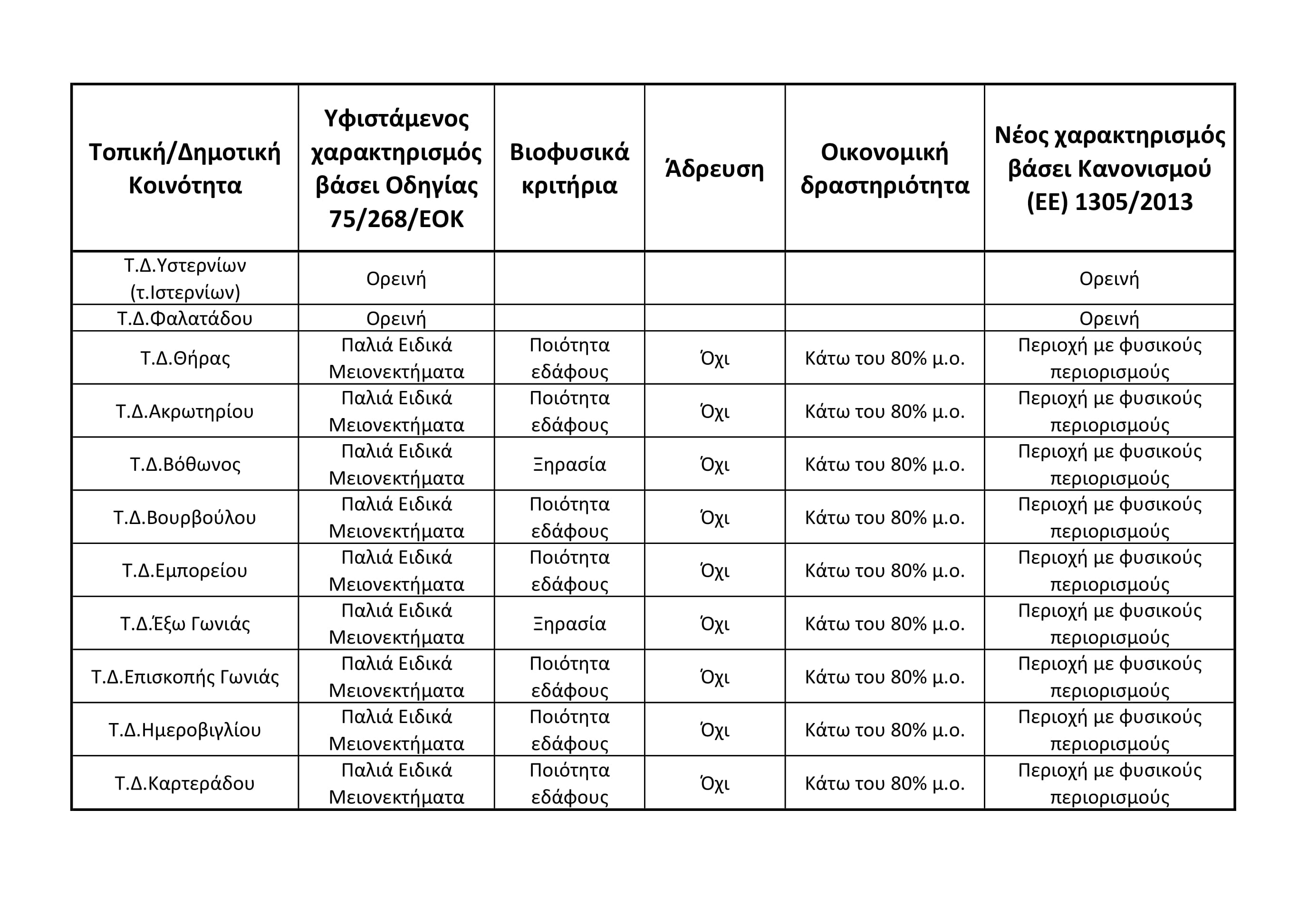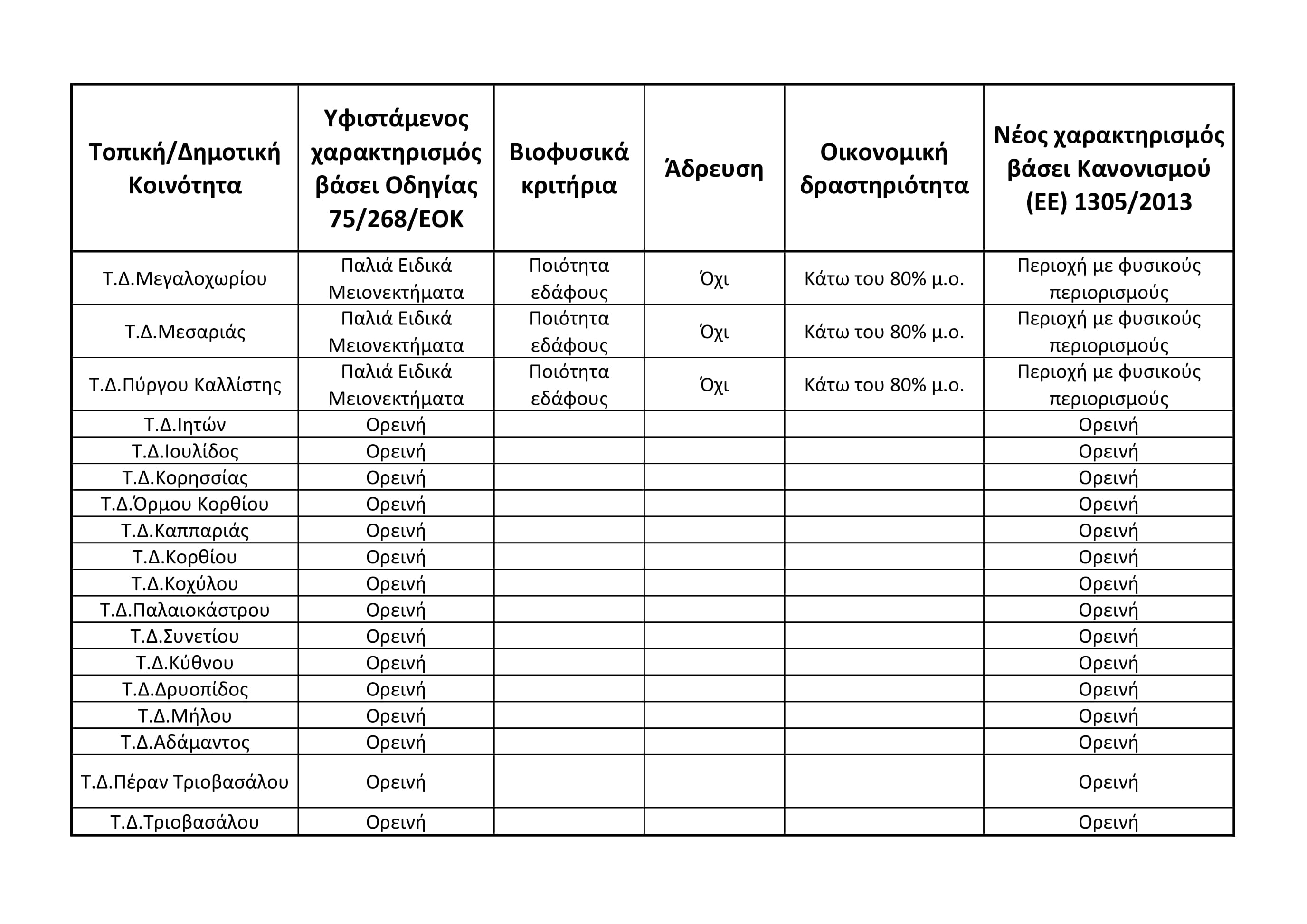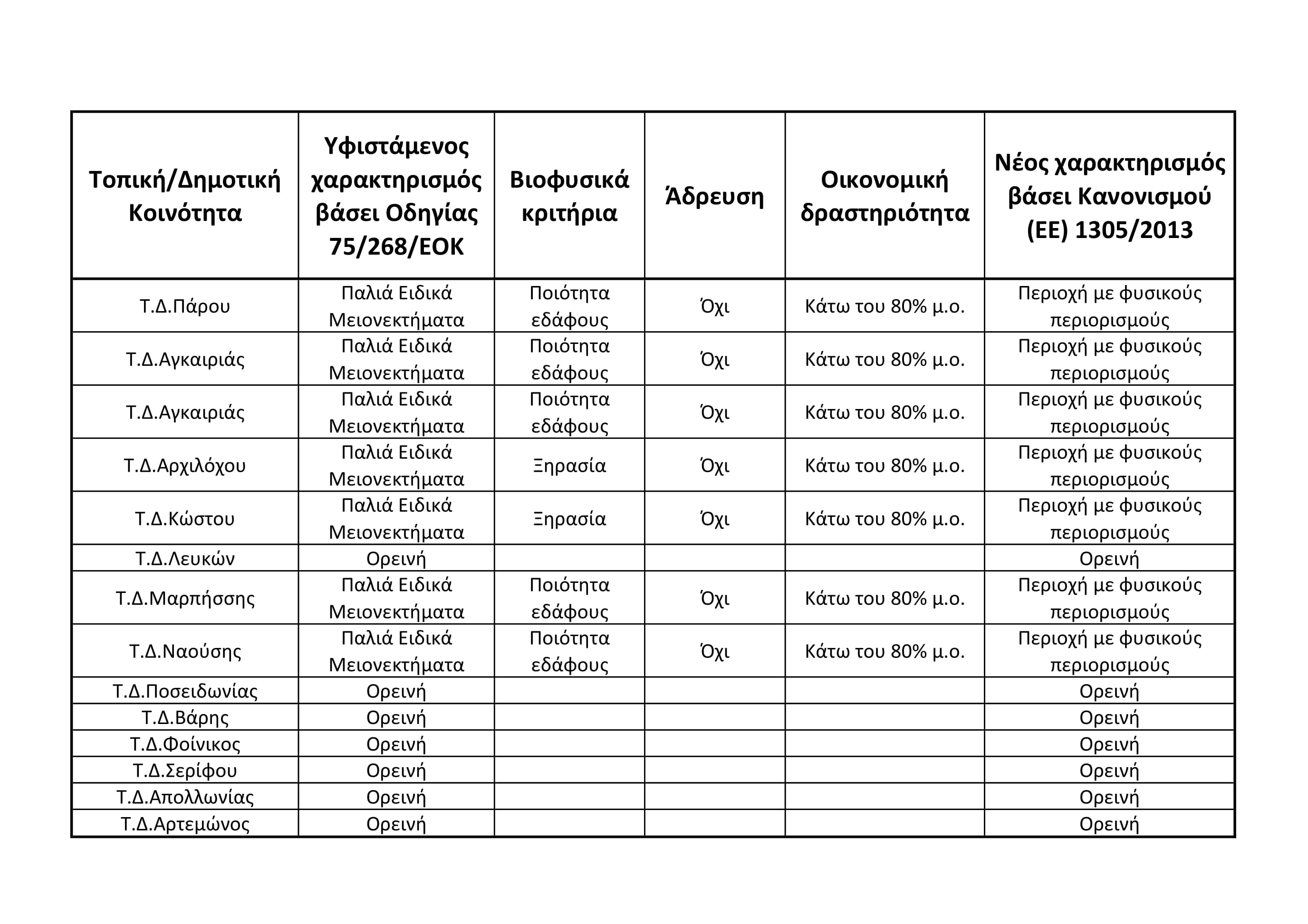 α) με φυσικούς περιορισμούς και β) με ειδικά μειονεκτήματα και βασίστηκε σε βιοφυσικά κριτήρια κοινά για όλα τα κράτη-μέλη, όπως το κλίμα, το νερό και το έδαφος.