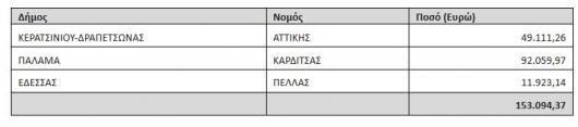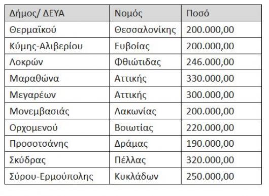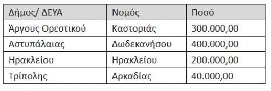 Τέλος, με χρέωση του αντίστοιχου λογαριασμού του ΥΠΕΣ, που τηρείται στο Ταμείο Παρακαταθηκών και Δανείων, εγκρίθηκαν επιχορηγήσεις συνολικού ποσού ύψους 940.000,00 ευρώ στους κάτωθι δήμους της χώρας για τη χρηματοδότηση των αναγκαίων εργασιών με σκοπό την αντιμετώπιση του φαινομένου της λειψυδρίας.