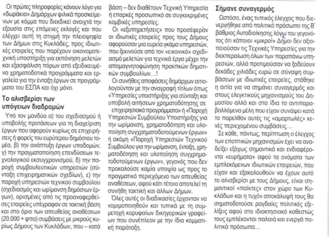Διαβάστε το δημοσίευμα, το οποίο κάνει λόγο για «δωράκια» δημάρχων σε ιδιωτικές εταιρείες: