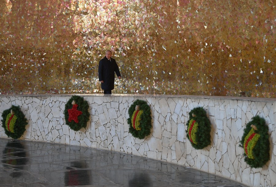 Ο Ρώσος πρόεδρος κατέθεσε στεφάνι στο σημείο όπου βρίσκεται η αιώνια φλόγα στην αίθουσα της δόξας και τήρησε ενός λεπτού σιγή.