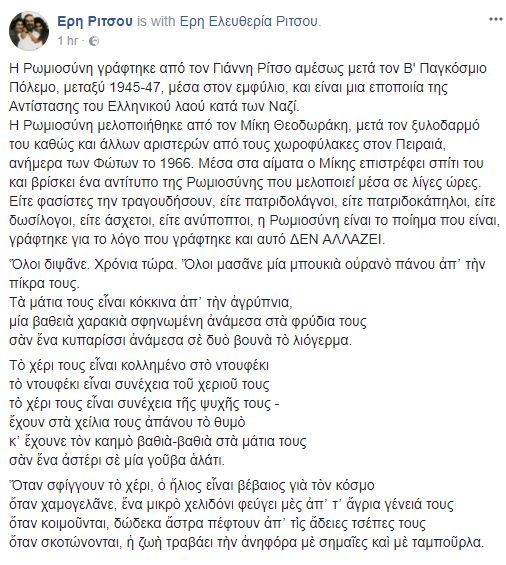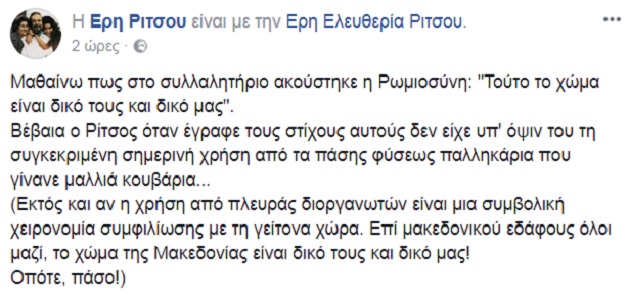 Η Έρη Ρίτσου, με αφορμή τη χρήση του μελοποιημένου ποιήματος του πατέρα της, Γιάννη Ρίτσου, στο συλλαλητήριο, παρενέβη με δύο αναρτήσεις στο facebook: