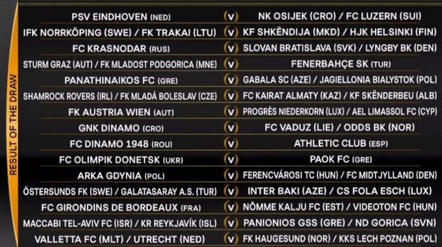 O ΠΑΟΚ θα ταξιδέψει στο Κίεβο για να αντιμετωπίσει την Ολίμπικ Ντόνετσκ, ο Παναθηναϊκός θα αγωνιστεί με το νικητή του ζευγαριού Γκαμπάλα – Γιαγκελόνια, ενώ ο Πανιώνιος, εφόσον προκριθεί, θα αντιμετωπίσει τη νικήτρια του ζευγαριού Μακάμπι Τελ Αβίβ – Ρέικιαβικ, όπως προέκυψε από την κλήρωση του 3ου προκριματικού γύρου του Europa League.