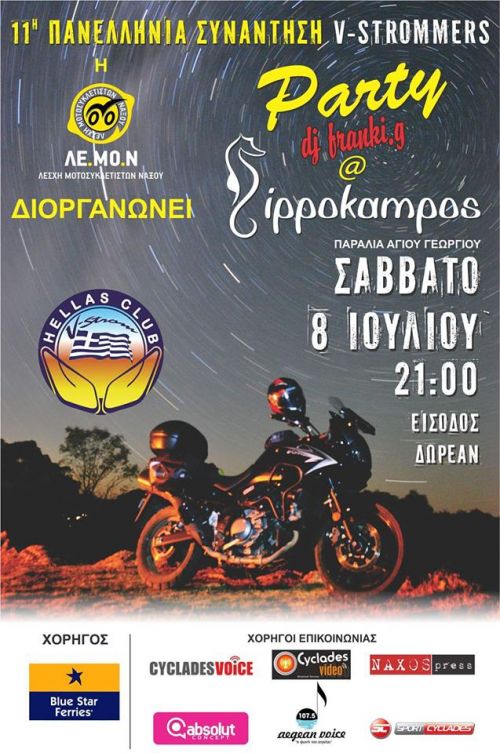 Στις 7-8-9 Ιουλίου πραγματοποιείται στη Νάξο η 11 Πανελλήνια Συνάντηση V-Strommers με οικοδεσπότη στο μεγαλύτερο νησί των Κυκλάδων τη Λέσχη Μοτοσικλετιστών Νάξου (ΛΕ.ΜΟ.Ν.)!