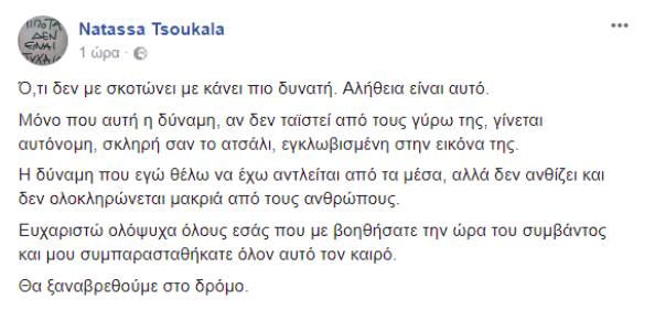 Χθες η Αναστασία Τσουκαλά, ένα μήνα μετά τον τραυματισμό της έγραψε μεταξύ άλλων, στον προσωπικό της λογαριασμό στο facebook πως «ό, τι δεν με σκοτώνει με κάνει πιο δυνατή» και «θα ξαναβρεθούμε στο δρόμο», ενώ ευχαρίστησε όσους την στήριξαν.