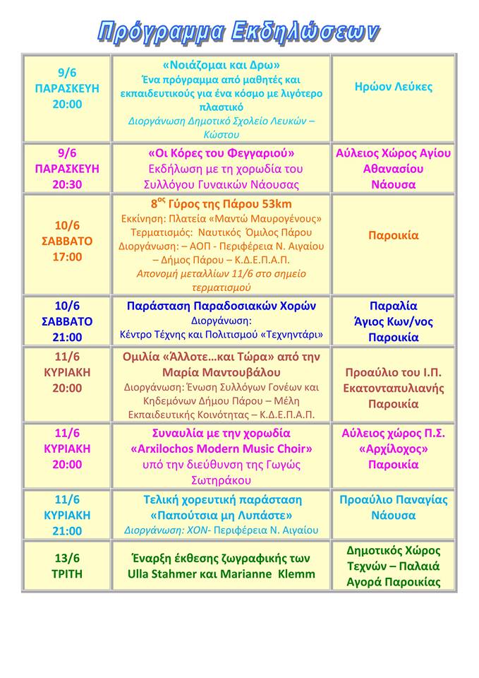 Η Κοινωφελής Δημοτική Επιχείρηση Πολιτιστικής Ανάπτυξης Πάρου (Κ.Δ.Ε.Π.Α.Π.) δημοσιοποίησε το πρόγραμμα των πολιτιστικών εκδηλώσεων που θα γίνουν στο νησί από την Παρασκευή 9 Ιουνίου έως και την Τρίτη 13 Ιουνίου 2017.