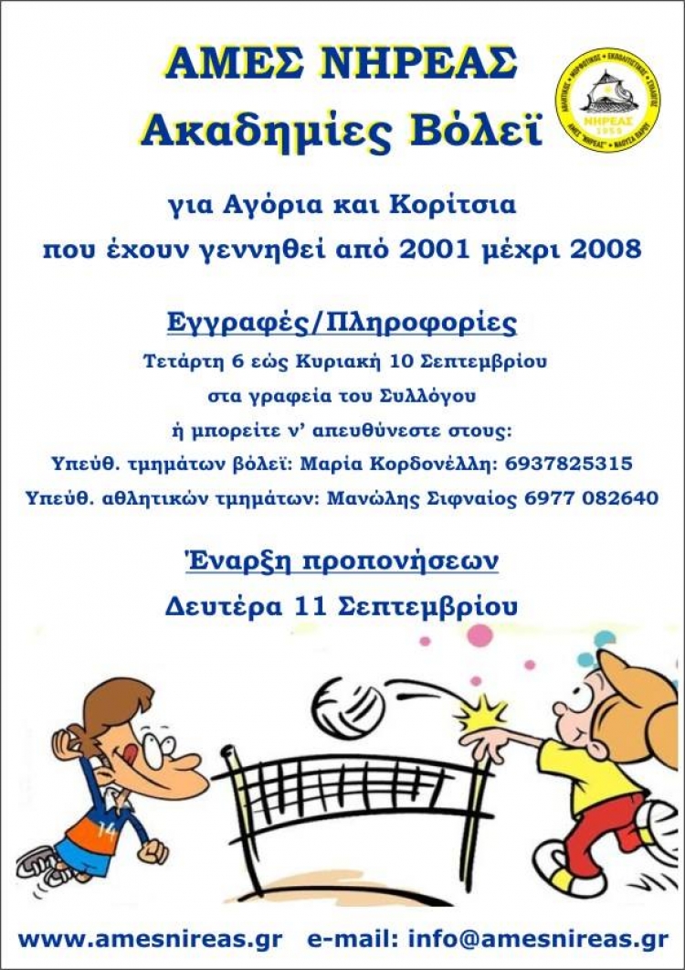 Το Δ.Σ. του ΑΜΕΣ Νηρέα ανακοίνωσε την έναρξη των εγγραφών, από την Τετάρτη 6 Σεπτεμβρίου, για τα αναπτυξιακά τμήματα βόλεϊ και την έναρξη προπονήσεων των αγωνιστικών τμημάτων, από Δευτέρα 11 Σεπτεμβρίου.