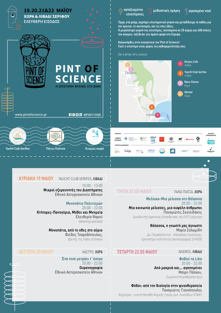 Το Pint of Science μετά την πολύ επιτυχημένη πορεία του σε 25 χώρες, 300 πόλεις, Αθήνα και Θεσσαλονίκη, φέτος θα ταξιδέψει για πρώτη φορά στη Σέριφο, το Βόλο και το Ηράκλειο.