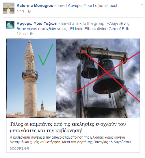 Μάλιστα, το κείμενο, το οποίο είναι ένα μείγμα ακροδεξιάς ρητορικής, φαντασιοπληξίας και θρησκοληψίας, αναφέρει πως τα κυβερνητικά στελέχη «θέλουν να απαγορεύσουν άμεσα τις καμπάνες» στο σχέδιο τους περί «αποχριστιανοποίησης της Ελλάδας»!