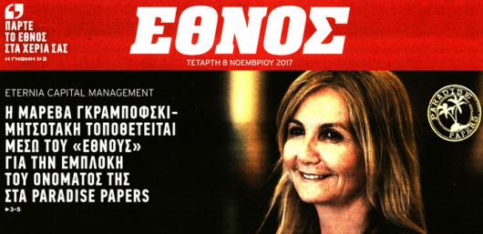 Η Μαρέβα Γκραμπόφκσι Μητσοτάκη εμφανίζεται στα στοιχεία των Paradise Papers ως μέτοχος 50% σε offshore εταιρεία με έδρα τα νησιά Κέιμαν στην Καραϊβική. Πρόκειται για την Eternia Capital Management που ιδρύθηκε το 2010. Η Μαρέβα Μητσοτάκη εμφανίζεται ως μέτοχος κατά 50% offshore εταιρίας με έδρα τα νησιά Κέιμαν στην Καραϊβική, σύμφωνα με την εφημερίδα το «ΕΘΝΟΣ».