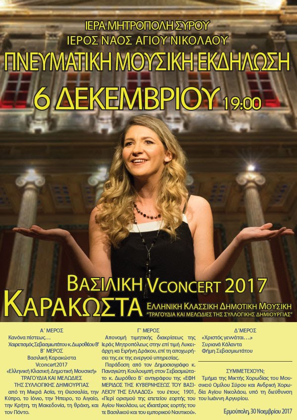 Πνευματική μουσική εκδήλωση, στο πλαίσιο του εορτασμού του Πολιούχου της Σύρου Αγίου Νικολάου, διοργανώνει η Ιερά Μητρόπολη Σύρου στον ομώνυμο Ιερό Ναό στην Ερμούπολη, την Τετάρτη 6 Δεκεμβρίου.