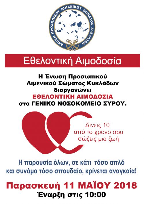 Εθελοντική αιμοδοσία διοργανώνει η Ένωσή Προσωπικού Λιμενικού Σώματος Κυκλάδων, στο Γενικό Νοσοκομείο Σύρου, την Παρασκευή…