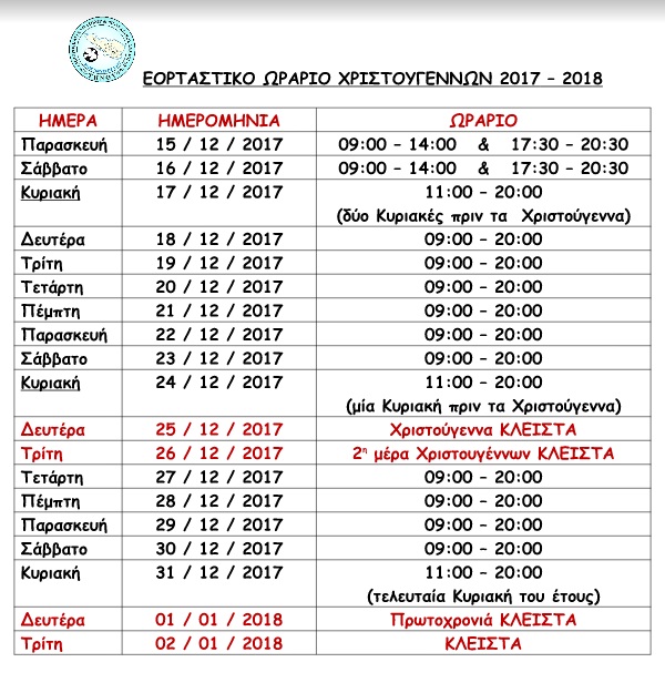 Το εν λόγω ωράριο ξεκινά από την Παρασκευή 15 Δεκεμβρίου και θα είναι σε διάρκεια μέχρι την Τρίτη 02 Ιανουαρίου 2018.